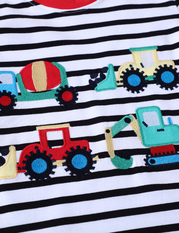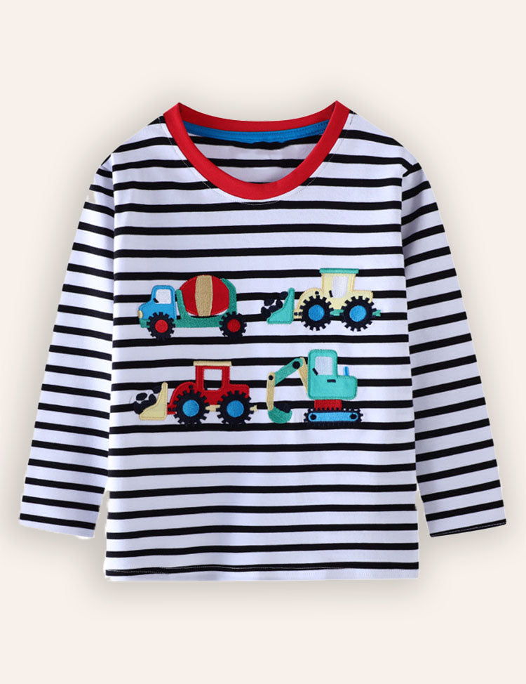 Construction Car Applique Striped Long Sleeve T-Shirt